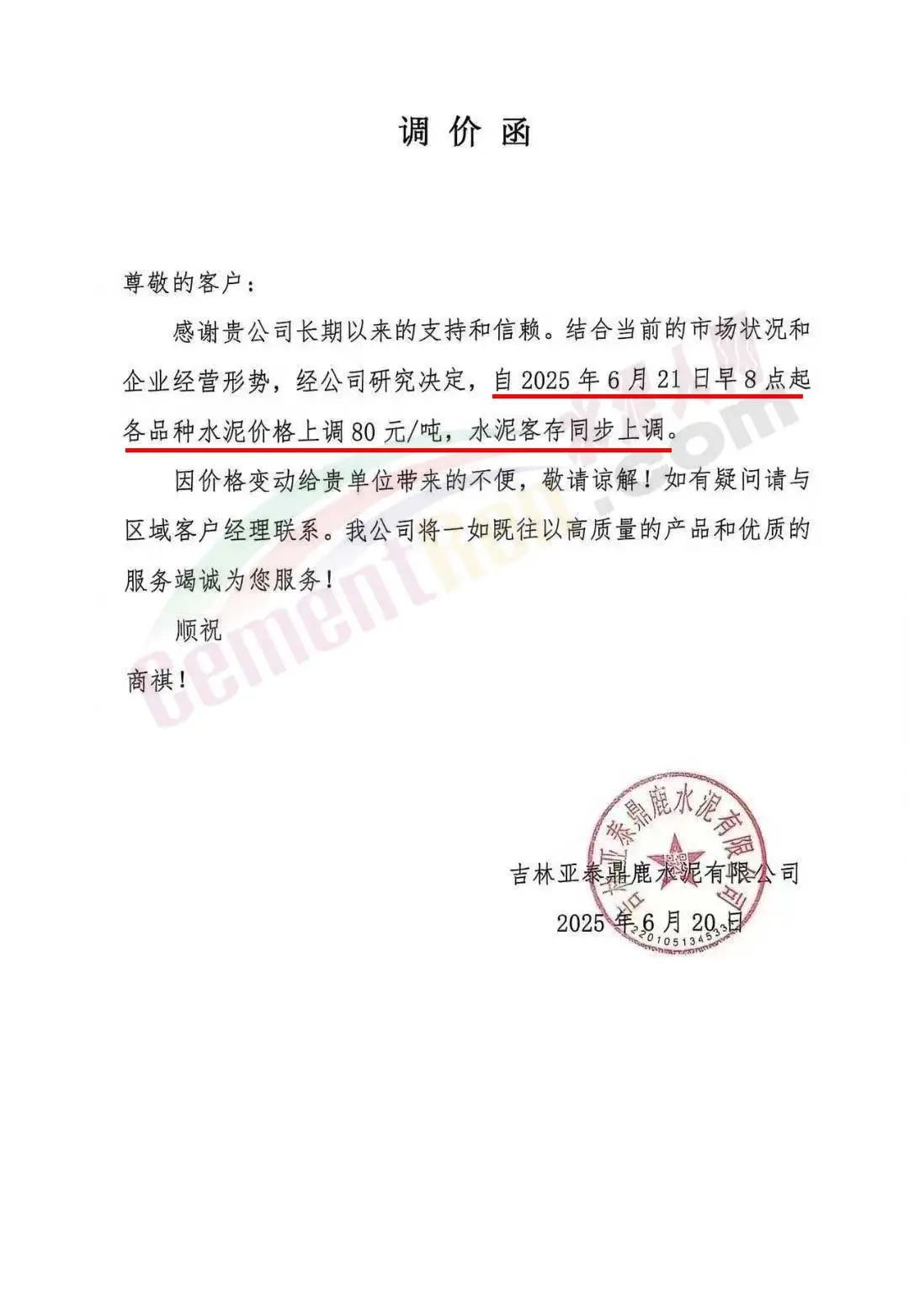 吉林亞泰鼎鹿水泥有限公司通知,結(jié)合當前的市場狀況和企業(yè)經(jīng)營形勢,經(jīng)公司研究決定,自2025年6月21日早8點起各品種水泥價格上調(diào)80元/噸,水泥客存同步上調(diào)。