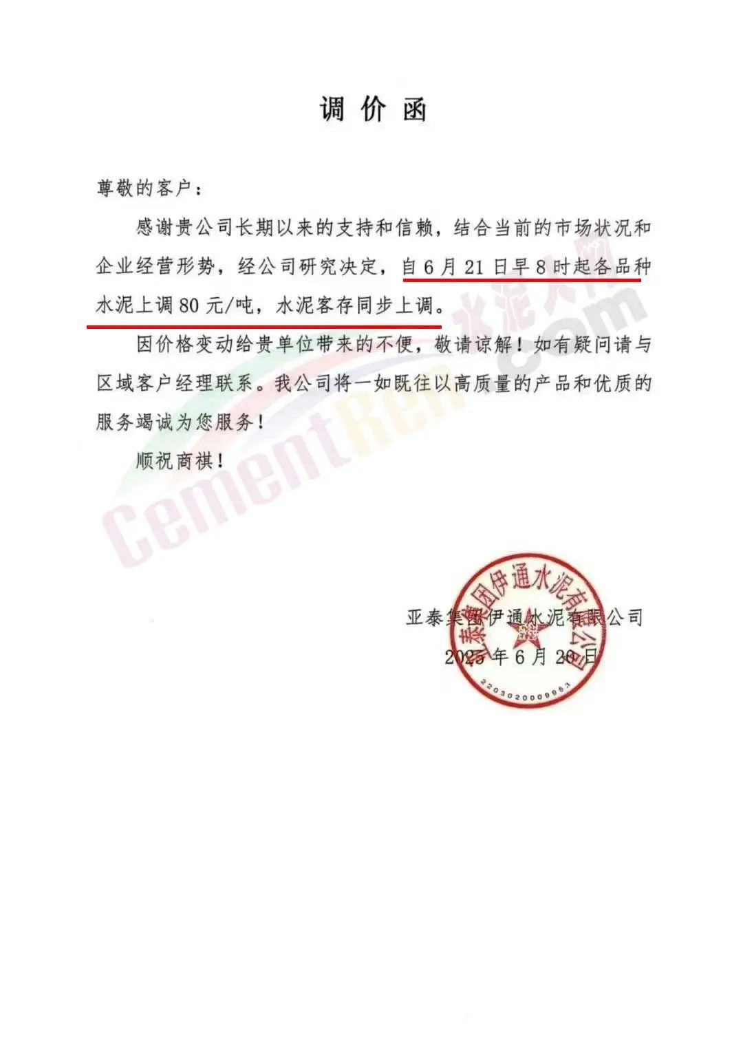 亞泰集團伊通水泥有限公司通知,結(jié)合當前的市場狀況和企業(yè)經(jīng)營形勢,經(jīng)公司研究決定,自6月21日早8時起各品種水泥上調(diào)80元/噸,水泥客存同步上調(diào)。