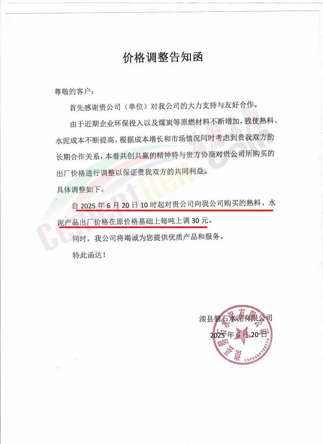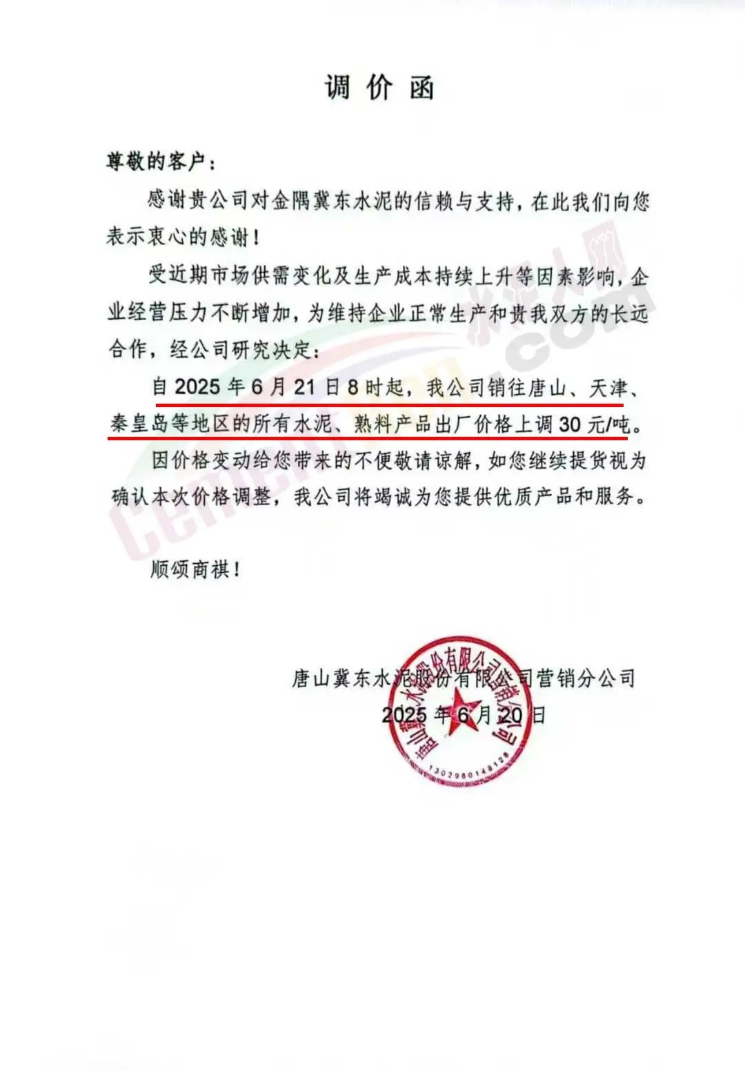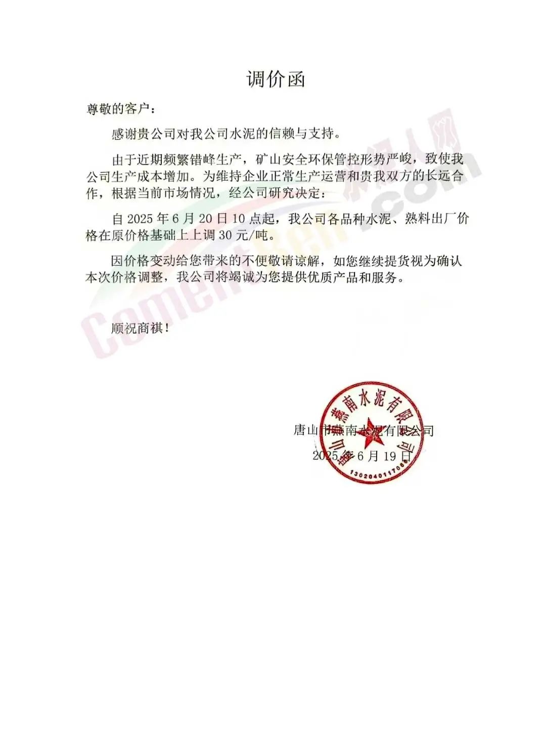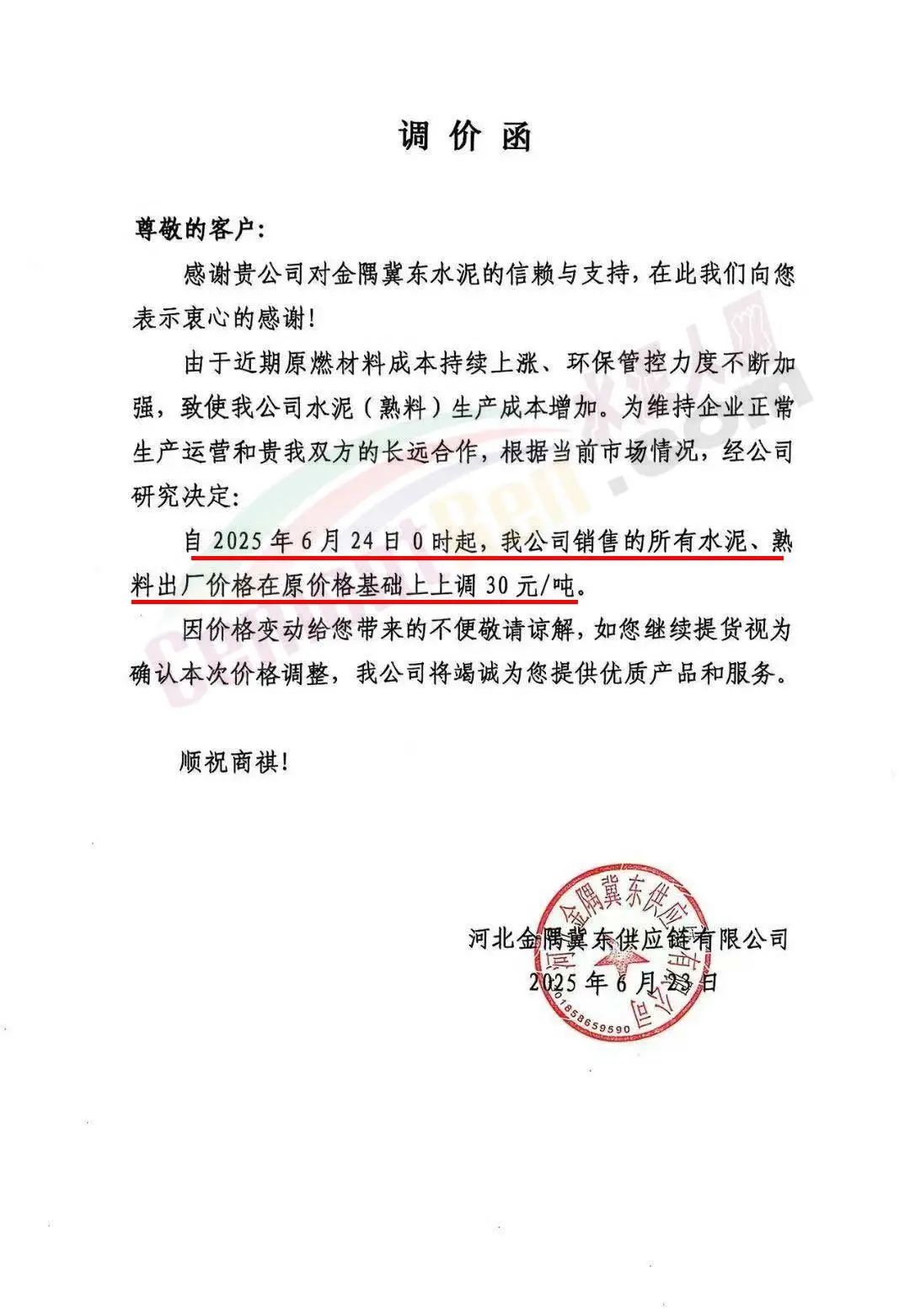 河北金隅冀東供應(yīng)鏈有限公司通知,近期原燃材料成本持續(xù)上漲、環(huán)保管控力度不斷加強,致使我公司水泥(熟料)生產(chǎn)成本增加。為維持企業(yè)正常生產(chǎn)運營和貴我雙方的長遠合作,根據(jù)當前市場情況,經(jīng)公司研究決定:自2025年6月24日0時起,公司銷售的所有水泥、熟料出廠價格在原價格基礎(chǔ)上上調(diào)30元/噸。
