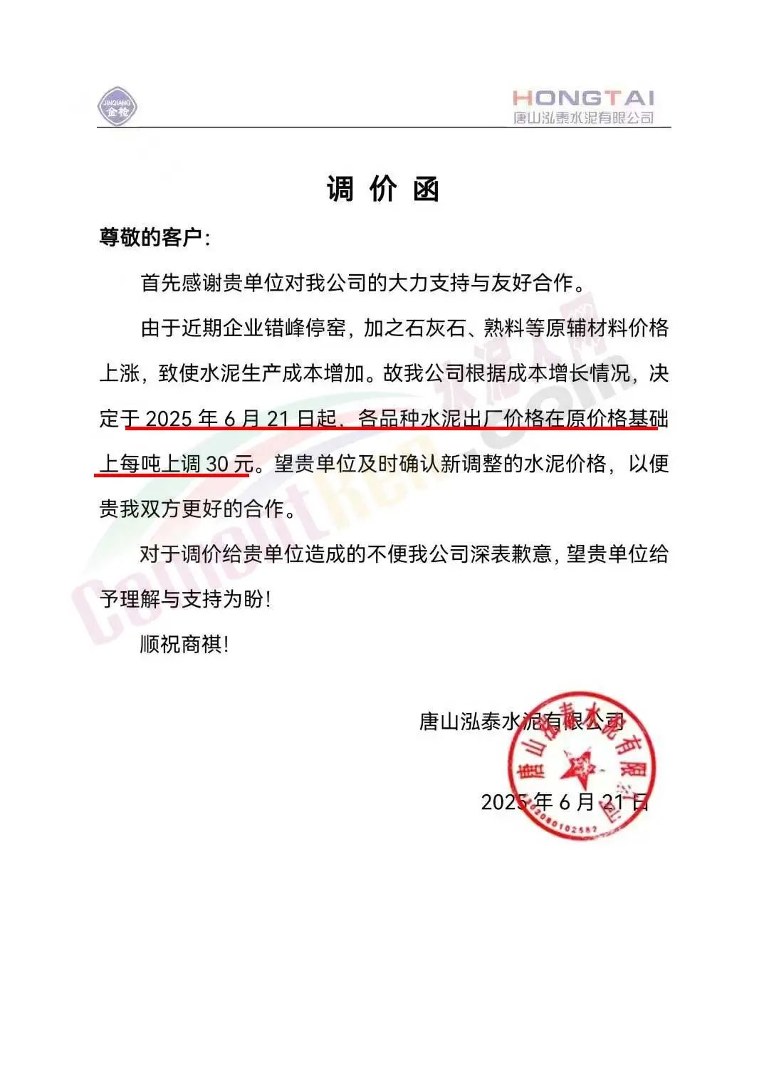 唐山泓泰水泥有限公司通知,6月21日起各品種水泥出廠價在原價基礎(chǔ)上上調(diào)30元/噸。